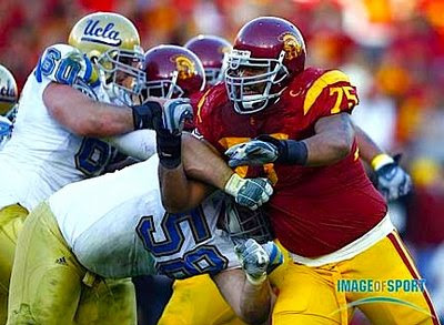 Sam Baker. A 4 year starter, Baker was a steady player for USC, opening up running lanes for USC's glutton of running backs and protected Matt Leinart and John David Booty from large defensive linemen. Sam will now be suiting up for my Dirty Birds down in the A-T-L where he will protect another high-profile QB and fellow 1st round pick in Matt Ryan. Thank you Sam for your hard work here at USC and for representing the university well. We will definitely miss his experience on the offensive line this upcoming season, but I'm sure Coach Carroll will find someone to step up. Congratulations again on being a 1st round pick Sam, we all know that you will do us proud with the Falcons.